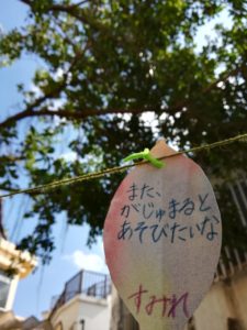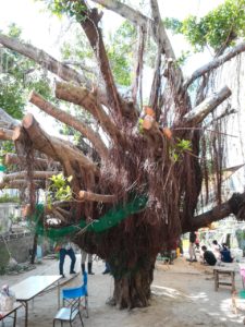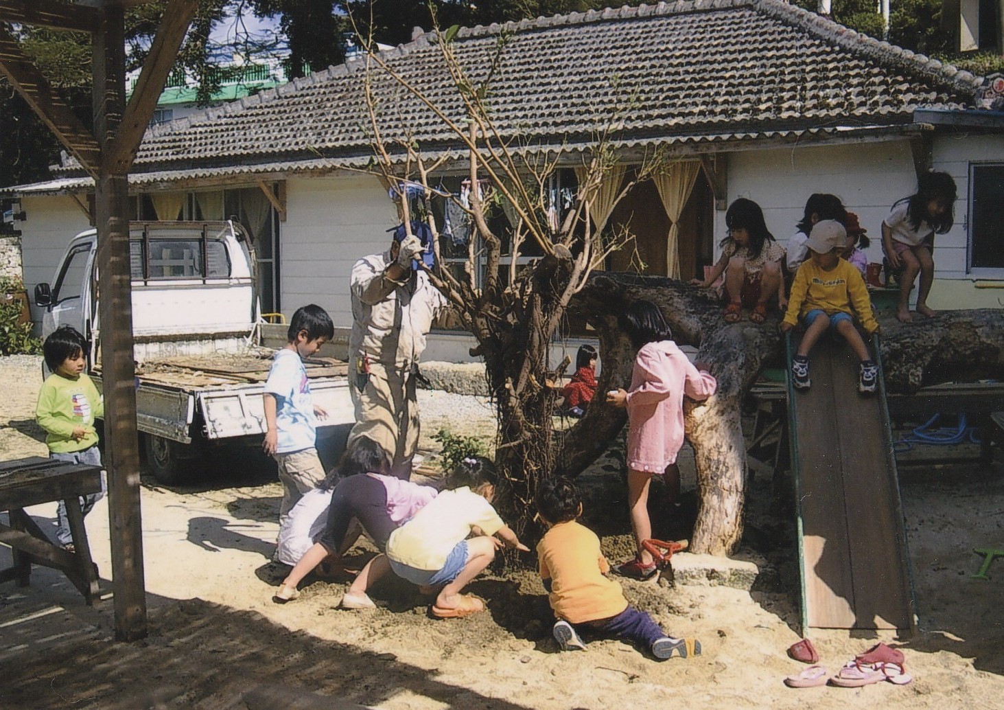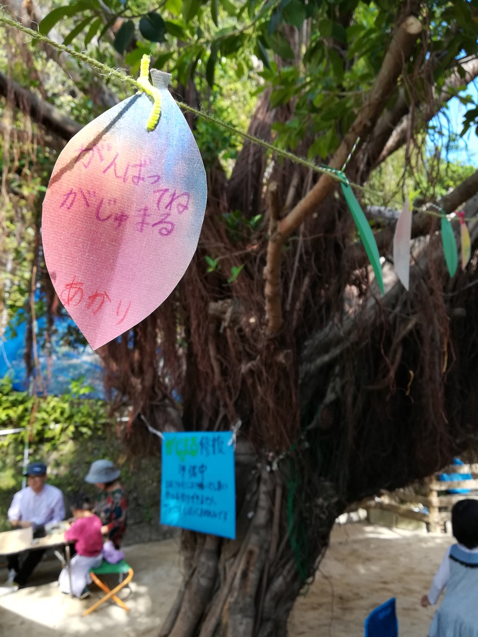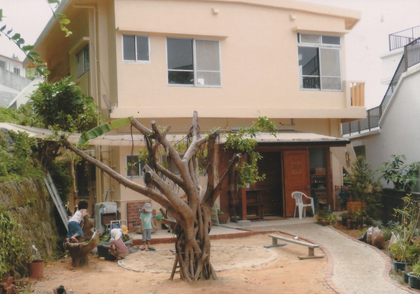さかのぼること今から約16年前、まあるが開園して間もない頃、当時の卒園生たちから一本のがじゅまるの苗木が贈られました。その後まあるの庭に根付きひとまわりほど大きく成長した木を、12年前園舎移転の際に現在の場所に移植しました。長年、子どもたちに木登りやブランコを楽しませてくれ、暑い夏には心地よい日陰を作ってくれたがじゅまる。