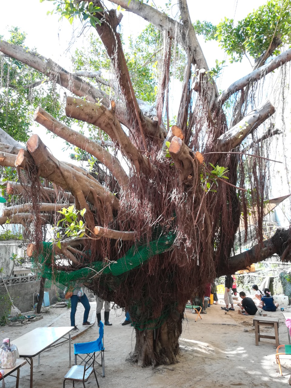 現在がじゅまるは、続く台風対策のため、多くの枝幹を剪定し、造園業者による本格的な立て直し作業を行うまでは、安全のため木登りもできない状態です。修復には、周辺に支柱を立てて数年かけてがじゅまるを固定する必要があります。